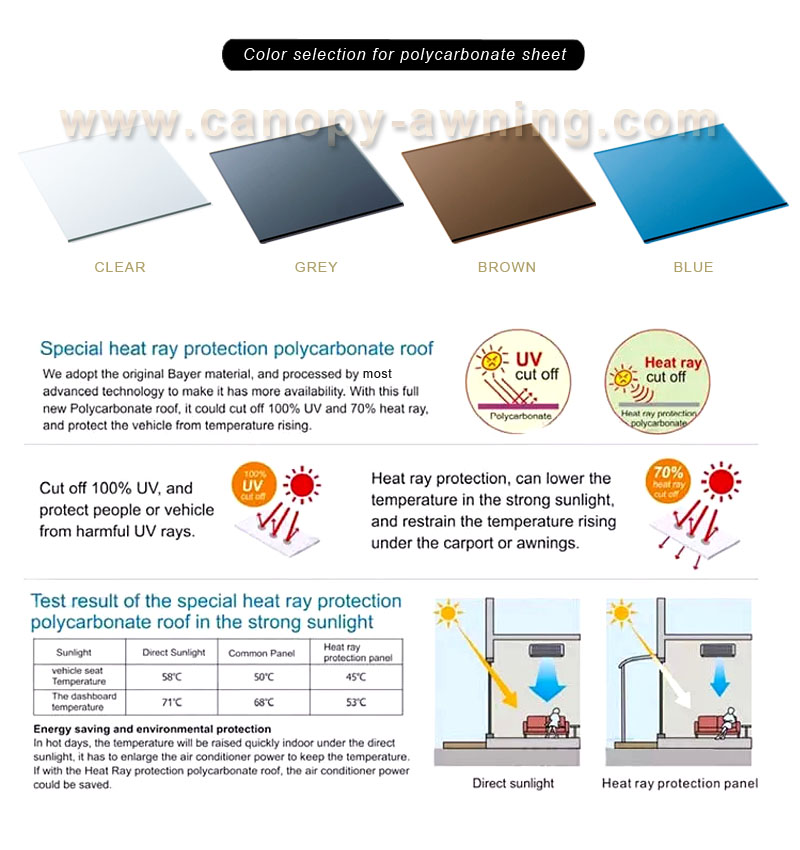 2,UV resistance.There is a UV blocking layer on the surface of polycarbonate solid sheet, which can filter about 98% ultraciolet radiation, so it can protect of your car well